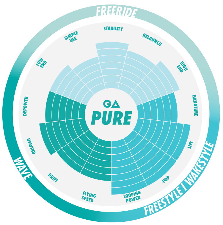 Enjoy pure performance in waves, during freestyle and performance freeriding with our brand-new Pure. Its progressive arc design provides superb rigidity, which leads to an extremely responsive construction that reacts to your steering impulses accurately. The increased aspect ratio leads to a homogenous power distribution, adding even more control to the already forgiving jumping characteristics. With its fast turning speed, great drift, good looping behaviour and explosive power generation the Pure is the perfect allrounder for radical riders.