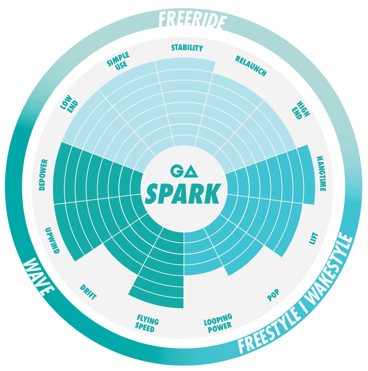 One freeride kite that performs outstandingly well in all types of conditions and for every kitesurfer – the Spark makes each session memorable. Throughout its large wind range the Spark is direct and easy to handle with its comfortably low bar and steering pressure, always providing impressive power to go upwind or launch into huge jumps with ease. The balanced blend of stable flying characteristics and direct handling allow you to both cruise and go radical with one kite only. Power, fast turning speed, better drift and versatility will spark kitesurfers more than ever.
